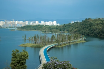 融合生态与科技打造未来之城 对岸被誉为西部地区“最强大脑”的“成都超算中心”,中科院大学、国家农业科技中心 这绿道和科技城串联起优美自然生态公园与现代城市发展的河流 被天府新区人称为“母亲河”的鹿溪河
