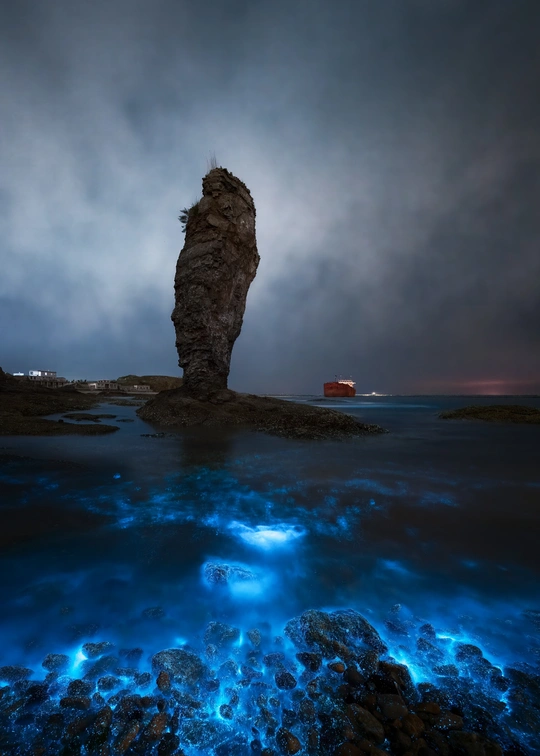 夜晚随着潮汐冲击,荧光海的蓝色是我见过最美的蓝色了。拍摄采用堆栈的技巧。连拍16张,后期先平均值堆栈降噪保留画质,再最大值堆栈合成荧光海蓝色的高光细节。