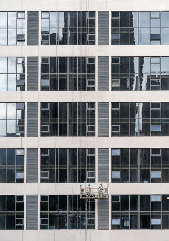 建筑工人正在对高耸入云的大楼外立面粉刷涂料