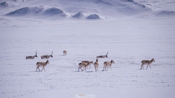 冬季的西藏,群山被大雪覆盖,地面上的积雪掩埋了一切,藏羚羊成群结队的行走在雪地上。