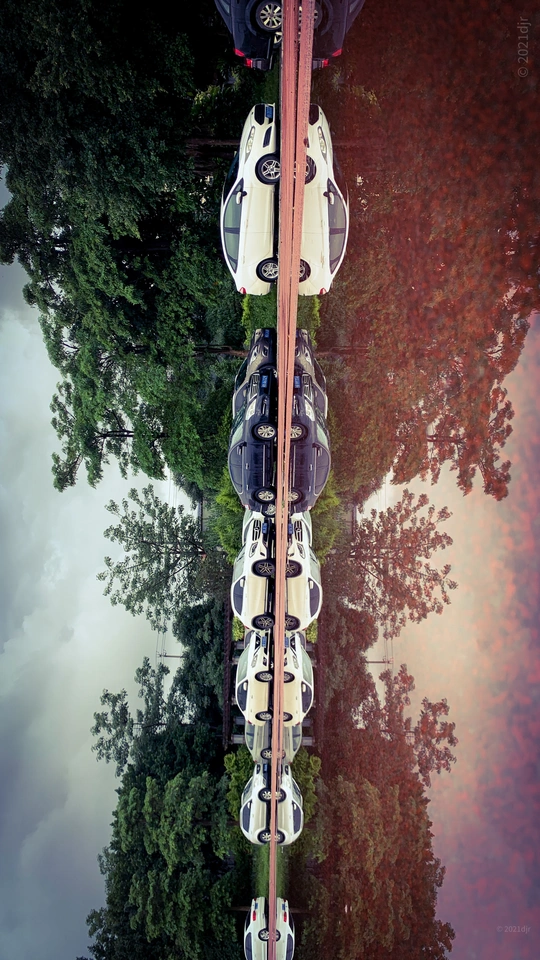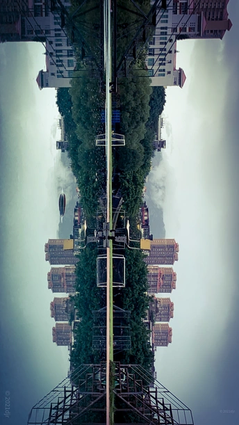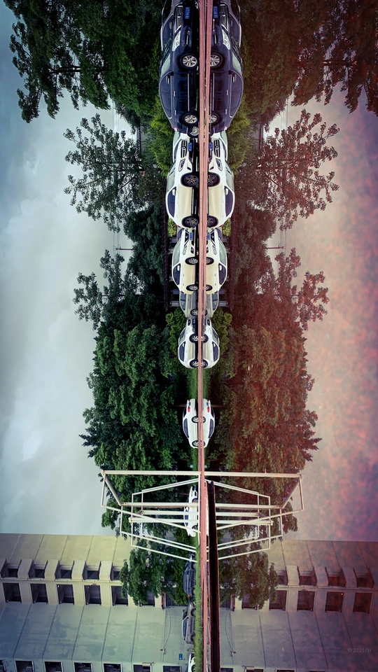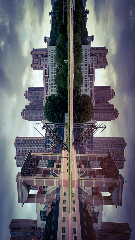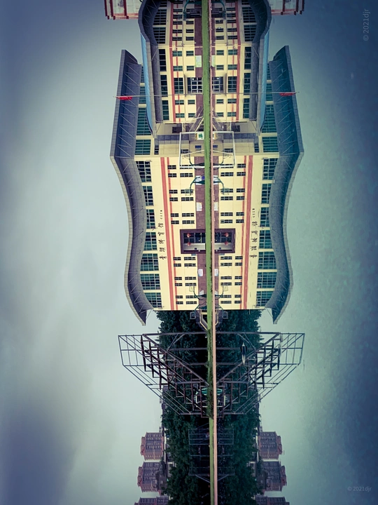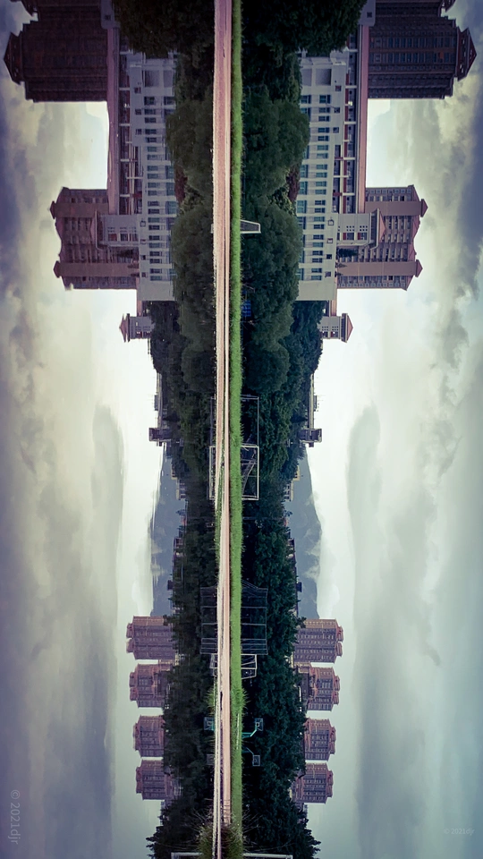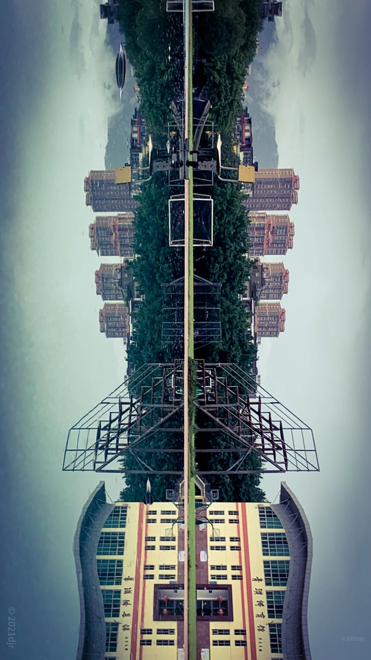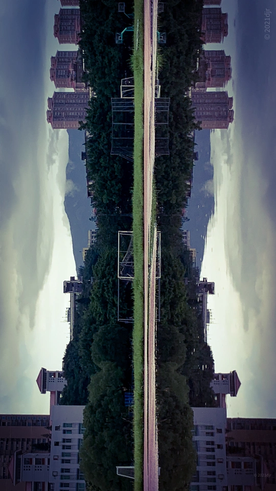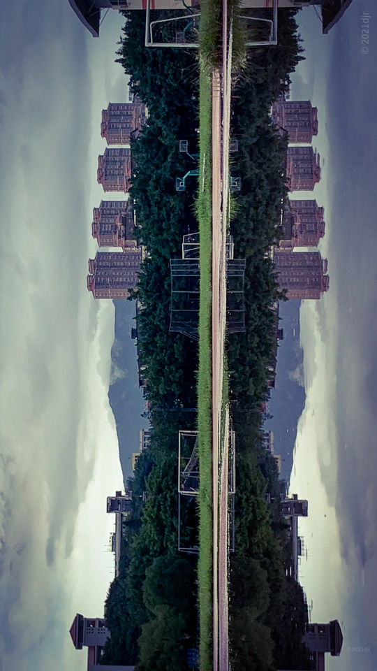 雨后学校操场,跑道积满水,透过水世界,发现了一完全对称空间。摄于莆田第六中学操场 2022.7.4