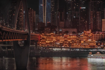徒步于江面,不断调整角度,记录下这辉煌绚烂的 场面。江面波光鄰动,宛如梦境一般。凌驾于江上的洪崖洞,闪着耀人的辉光,让人流连忘返。