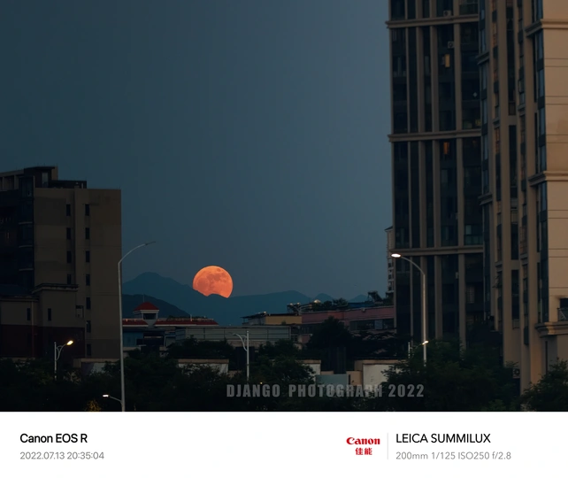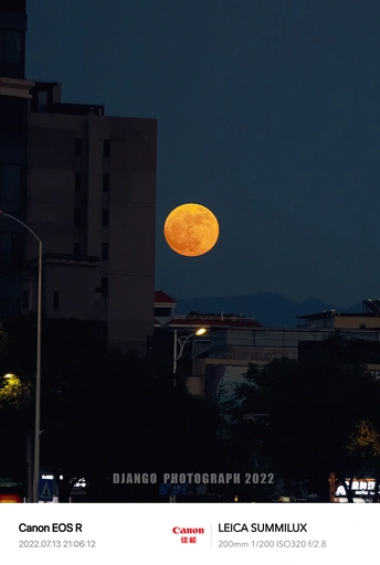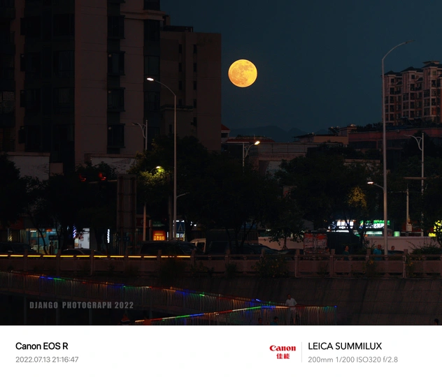 拍摄地:曲江江畔健身广场. 设备:Canon EOSR /EF 70-200 f/2.8L IS II USM. 新闻报道2022年最圆的超级月亮出现在7月13日晚,之前已从Moon phase App获悉月亮出现的具体时间,只是没有想到在广场附近正好能拍到,月亮拍的不多,自我感觉还有上升空间。或换一部残幅机X1.6倍率以获得更大月亮观感,不过上三脚架免不了 @米拍 @米拍社长 @米拍小助手