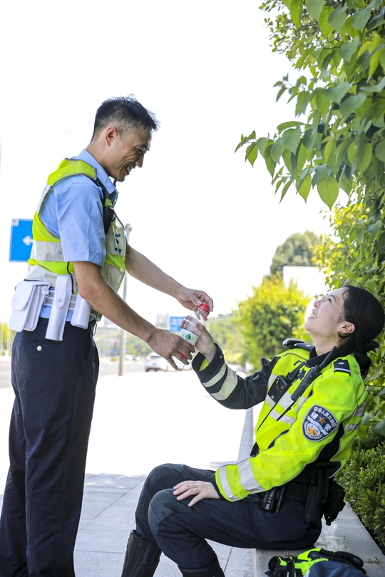 2022年7月7日,重庆渝北渝警骁骑开展高温勤务后纳凉,互相鼓劲打气。