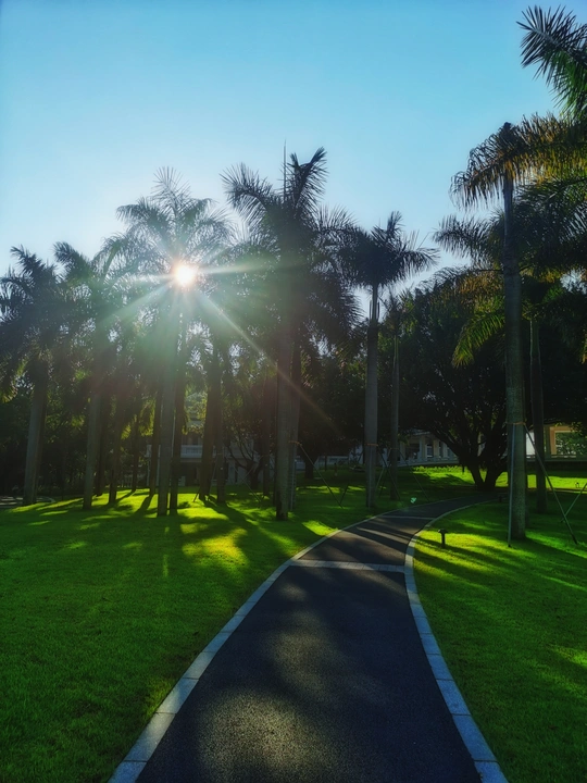 汕头华侨公园里有一片大王椰树林,高高矗立。太阳照在椰树上,疏漏在草坪上,留下斑驳的影子。