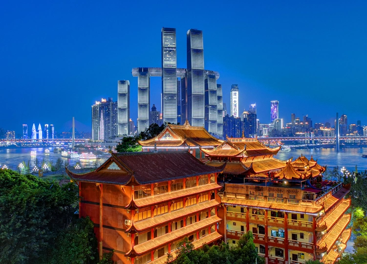 2020年8月10日拍摄于重庆市南岸区南滨路,长江两岸的百年古寺-千佛寺和重庆地标建筑来福士形成强烈的古今对比、冷暖对比。