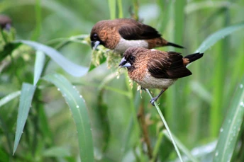 2022年8月2日早晨8点28分。在四川省成都市锦河河滩的草丛中,两只白腰文鸟正忙着吃草籽,这可能是它们的美味了。