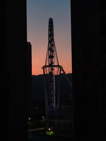 “横看成岭侧成峰,远近高低各不同。”摩天轮是永川区的新地标建筑高,一到夜晚,它便会开启绚丽的灯光秀:或五光十色、灿烂夺目,或造型百变、栩栩如生。但换个角度,从摩天轮的侧面看过去,虽没有了正面灯光秀的美丽,但它却宛如一条高耸入云的天梯,阶梯随着脚步变换着不同的颜色。