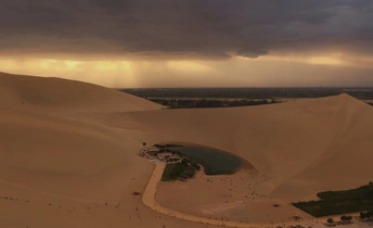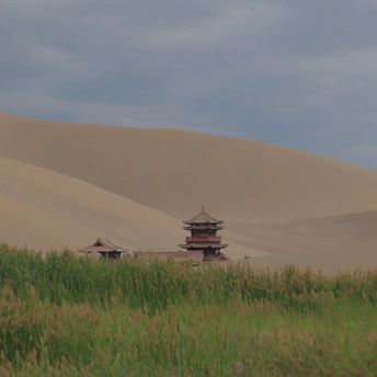 戈壁滩上的烈日与狂风,侵蚀着千年的长城与烽火台,阳关以西,玉门关外,他们是否也会午夜梦回,盛世长安。 沙漠绿洲,月牙泉,这次去时下了大雨,所幸雨停后依然在乌云裂缝中看见了落日。乌云像是为落日披上了帷幕,直至傍晚,帷幕渐渐拉开,太阳在游客们目送下,逐渐落下。