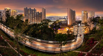 螺旋式带电梯塔楼,沿着山形盘旋蜿蜒上升的健康步道,展现出建设者们的完美设计,与地面交通、海沧大桥交相辉映,演奏出一曲恢宏的城市交响乐。