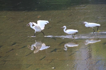 清晨,一只白鹭,一不小心抓住了一条小泥鳅。后面竟然跟来了两个小弟。于是,一场因为争夺口中食的追逐立即开始了。 白鹭(英文名称:Egret):白鹭属共有13种鸟类,其中有大白鹭、中白鹭、小白鹭和黄嘴白鹭四种,体羽皆是全白,均习称为“白鹭”。这四种白鹭均是中等体型(45—90厘米)的白色鹭。与牛背鹭的区别在体型较大而纤瘦,嘴及腿黑色,趾黄色,繁殖羽纯白,颈背具细长饰羽,背及胸具蓑状羽;中白鹭体型中等,无羽冠但有胸饰羽;小白鹭和黄嘴白鹭体型小,羽冠及胸饰羽全有。 中文名:白鹭 界:动物界 门:脊椎动物门 亚门:脊椎动物亚门 纲:鸟纲