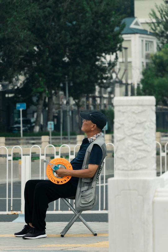 2022.8.12永定门公园拍摄 大爷坐着户外椅悠哉悠哉的放风筝