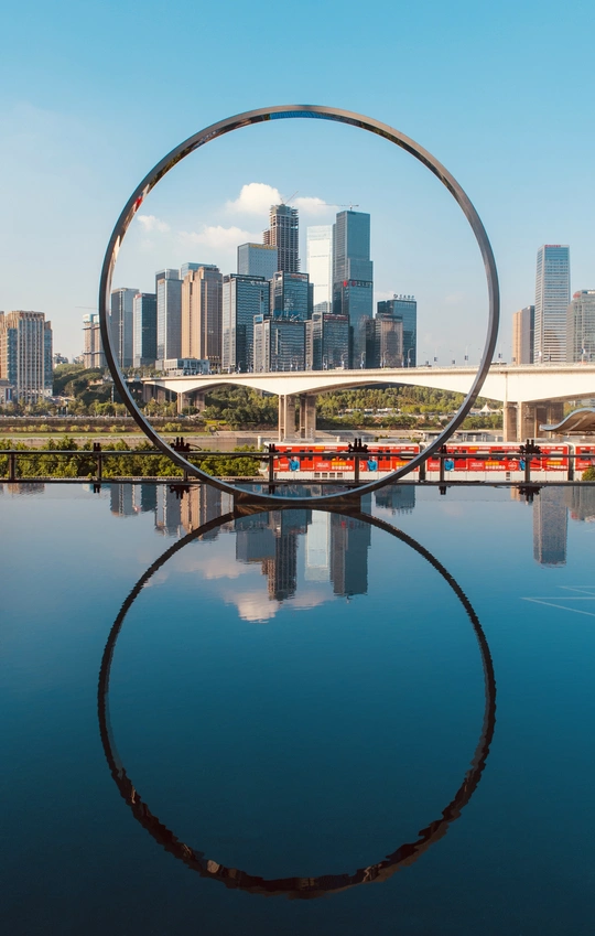 一座像指环的雕塑,将江北金融中心圈在画面里,一辆开往春天的列车飞驰而过……