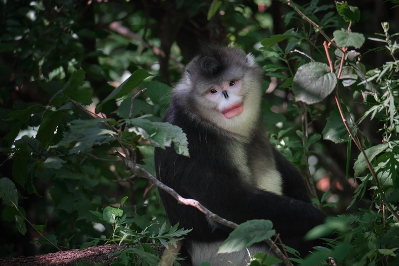 塔城香格里拉滇金丝猴国家公园的滇金丝猴一家子,幼猴的毛色是灰白的,成年后逐渐变深,唇色“色号”也越来越粉红。长松萝是它们最喜爱的食物之一,幼猴活泼极了,边吃边玩、上蹿下跳,成年猴则悠闲的细嚼慢咽,觅食后,一家子向山下移动,慢慢消失在我们的视野中。这次近距离观看了滇金丝猴,感觉猴子也有“猴品”,滇金丝猴温文尔雅,跟我们始终保持着安全距离,不像“弼马温”猕猴,又抢又挠,据说当地人说也不会偷抢农作物,真是一宝🐒
