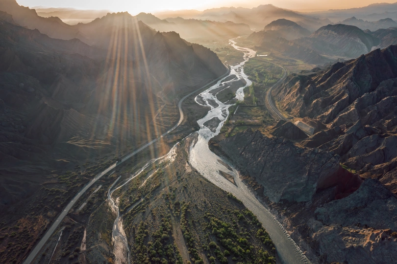 新疆维吾尔自治区阿克苏地区的天山神秘大峡谷,早晨的日光洒在静静的河谷之中。一条小溪和铁轨,独库公路向着远方延伸。