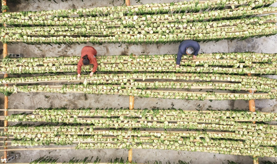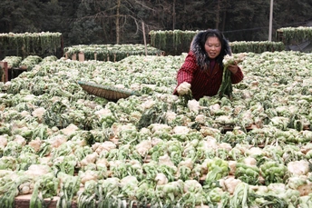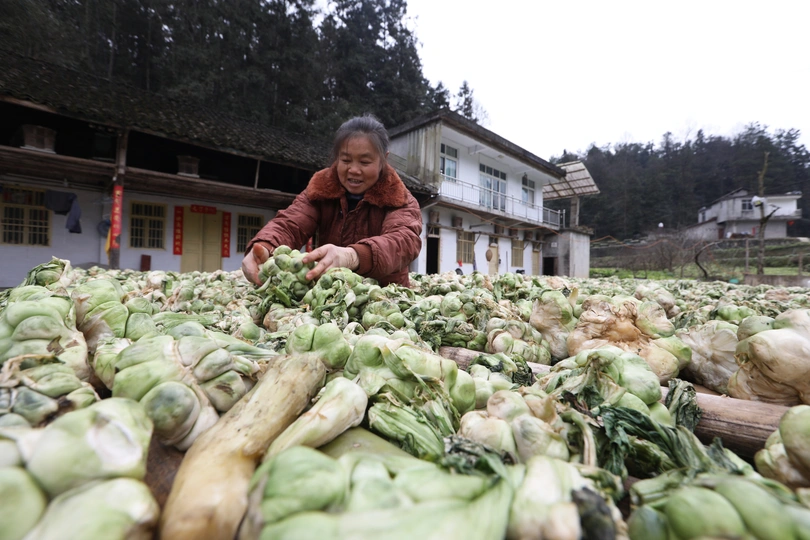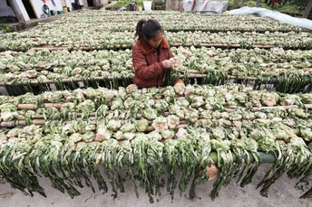 初春时节,重庆市彭水苗族土家族自治县汉葭街道柏杨村的家家户户的院坝里都晾晒着腌制后的青菜头,村民们陆续开始制作传统手工盐菜销售促增收。 青菜头是榨菜和盐菜的主要原材料,柏杨村村民利用青菜头手工制作盐菜已有20多年历史。主要做法是青菜头采收后先风干一两天,然后进行入池腌制、晾晒、第二次入池腌制、清洗、装罐密封等流程。在巩固脱贫攻坚成果与乡村振兴有效衔接中,柏杨村两委将青菜头作为村里的主导产业,扩大青菜头种植规模,拓宽盐菜销售渠道,持续促进村民增收。目前,全村青菜头种植面积达300亩,年产手工盐菜80吨。手工盐菜除了供应当地县城农贸市场、餐馆外,还销往重庆主城、杭州等地,深受市场青睐。