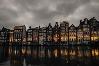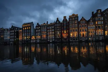 阿姆斯特丹,夜色中像瓶子一样的建筑倒影在运河中。