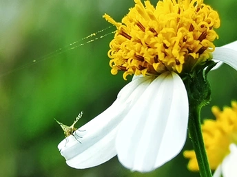 盛开的鬼针草,蚱蜢停留在白色的叶子上。