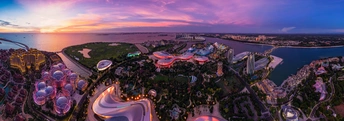 填海面积7.8平方公里的海花岛,1号岛为国际旅游度假区,是海南省花三角梅的形状,两边的2号岛、3号岛是浪花形状,为居住功能区。全景图里可以看到最上面的2号岛和1号岛大部分区域,有欧堡酒店、国际会议中心、海洋乐园、水上王国、希尔顿双塔酒店、运动健身中心、国际会展中心、免税购物中心、博物馆、影视娱乐音乐厅、中央公园、观光塔等。