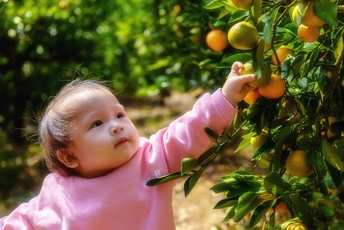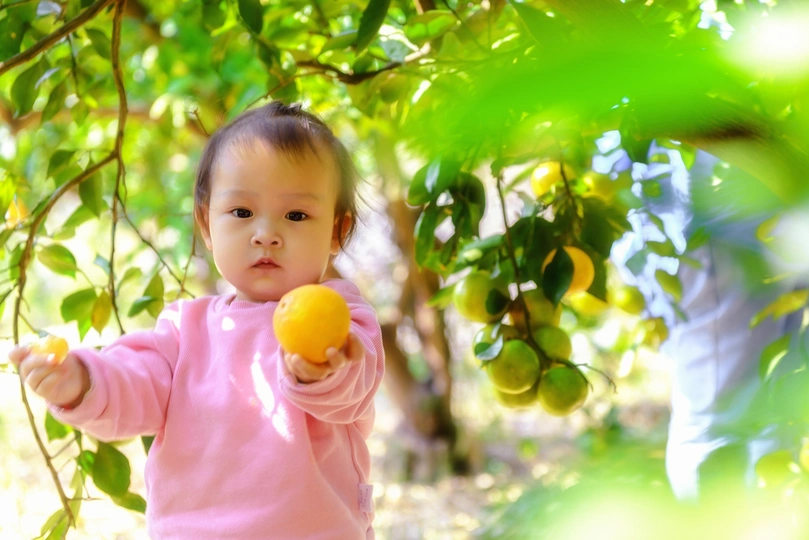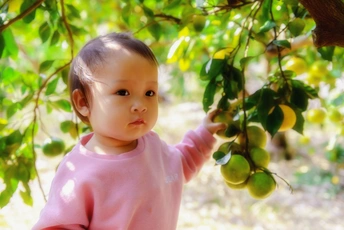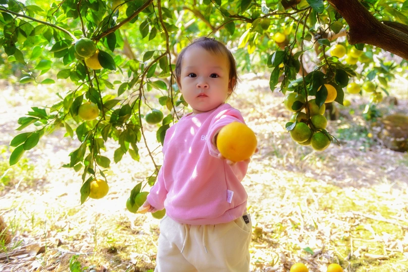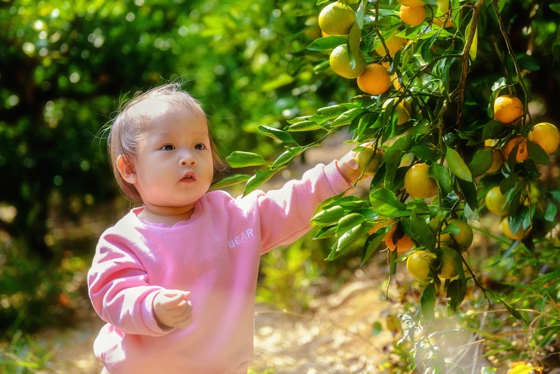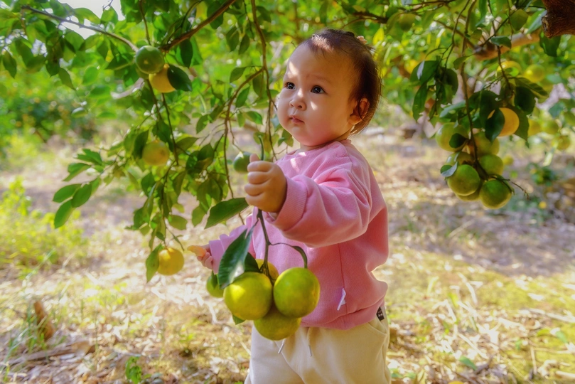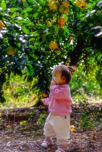 1岁3个月的小孙女在柑橘园里,有模有样,似为宜昌柑橘代言!