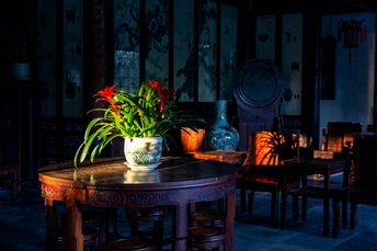 苏州留园内五峰仙馆,因梁柱及家具均以楠木制作,俗称为楠木厅。屋中保存有一件号称“留园三宝”之一的大理石天然画“雨过天晴图”,此石产于云南点苍山山中,直径一米左右,厚度也仅有15毫米,表面中间部分隐隐约约群山环抱,悬壁重叠,下部流水潺潺,瀑布飞悬,上部流云婀娜,正中上方,轮白白的圆斑,就像一轮太阳或者一轮明月,这是自然形成的一幅山水画。一抹阳光射来,主人在桌上放上盆景,装修精丽、陈设雅洁的厅堂,更多了一份惊喜和温馨。#苏州园林# #留园 ##秋色 #夕阳