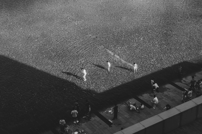 在博物馆的顶楼向下看时,发现下地上在水池嬉戏的大人与孩童。