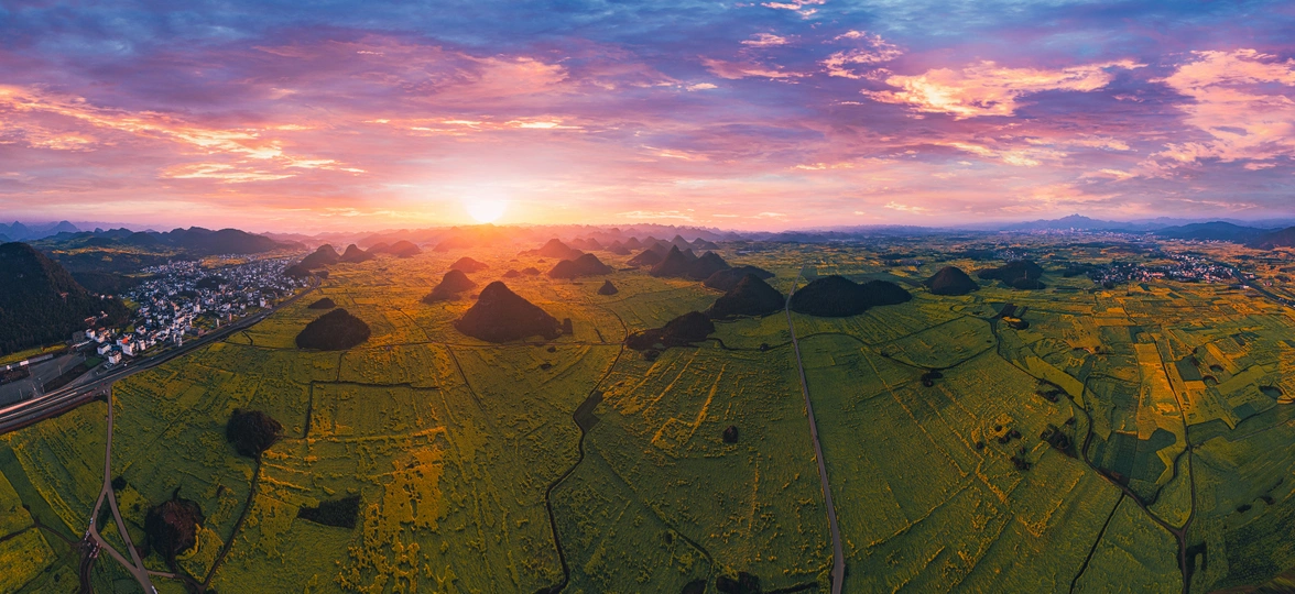 日出时分,朝霞绚丽,大地锦绣,阳光洒在希望的田野。