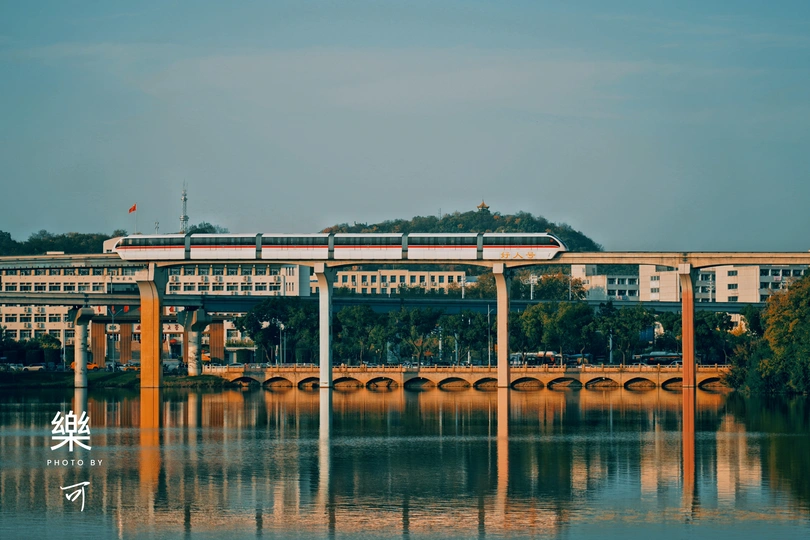 芜湖的好人号轻轨1号线从镜湖上驶过,此处也是1号线2号线的交汇处,背景是安徽师范大学老校区。远处还能看到赭山和赭塔!