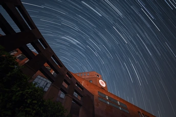 在城市光污染严重的地区,规划多日,总算等到了一个晴朗无云的夜晚,为了使光污染的程度最小,选择在后半夜人造光源大量熄灭后拍摄,在寒冷漆黑的角落蹲守两个小时,一共拍摄128张,汇聚成这一张绚烂的星轨,美丽无比!