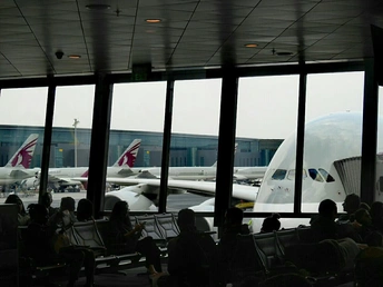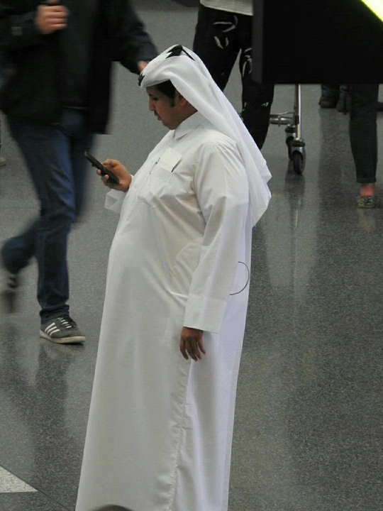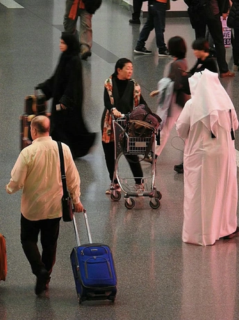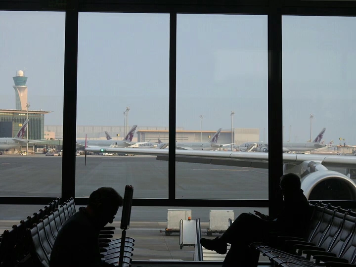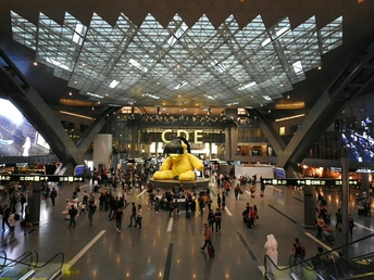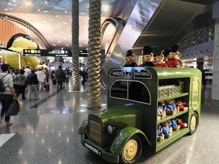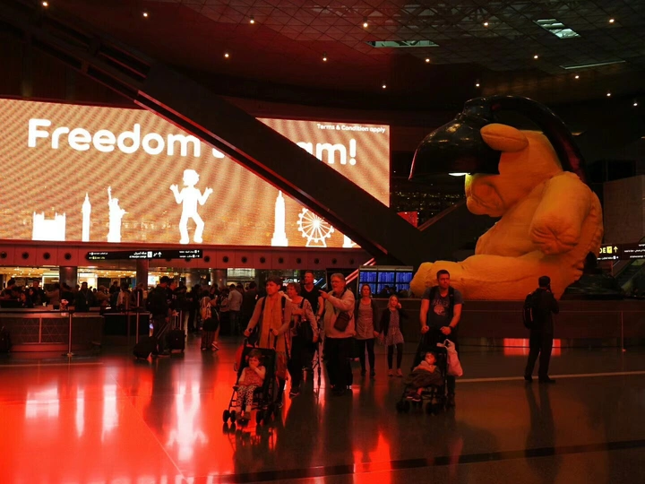 中东三大土豪航空公司阿联酋、伊蒂哈德、卡塔尔,以价优和服务吸引乘客,但通常没有中国直飞欧洲的航线,如卡塔尔航空就需在卡塔尔首都多哈转机。 穿梭于世界各地的游客常常会在大厅中央的熊玩偶前留个影,去到DE区还要坐几分钟的室内有轨交通才能到达,可见机场之大。(2019年3月拍摄)