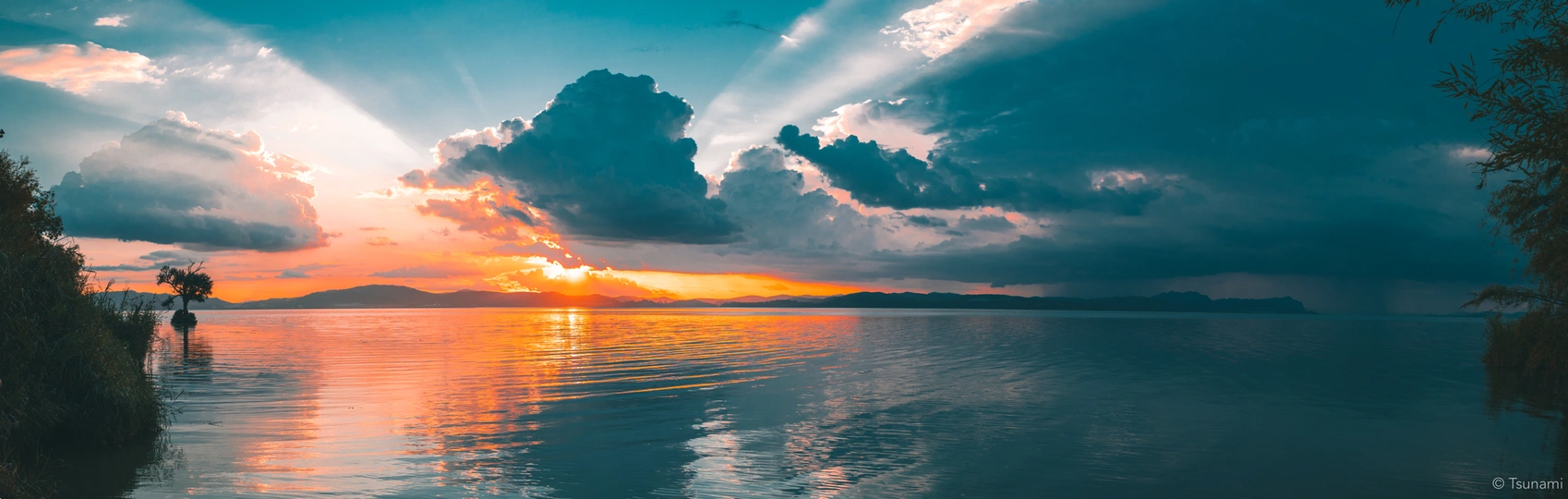 此图拍摄于海晏村,不是网红沙滩那个,是晋宁的海晏村。虽然走错了地方,但也收获了不一样的美景[偷笑] 图中左侧有着日落的万丈光芒,而右侧却大雨滂沱,这也是高原气候的体现