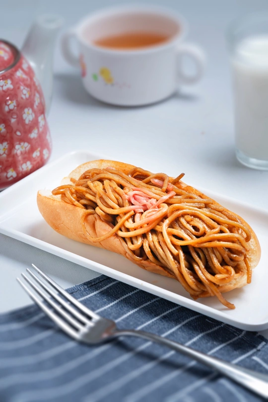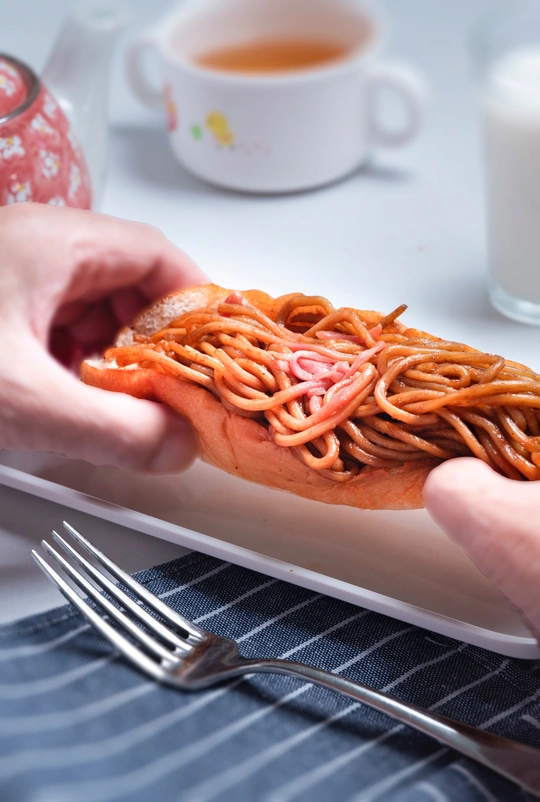 面包夹上面条是在日本便利店买的。松软的面包夹上可口的炒面别有风味,第一次尝试,觉得特别好吃。
