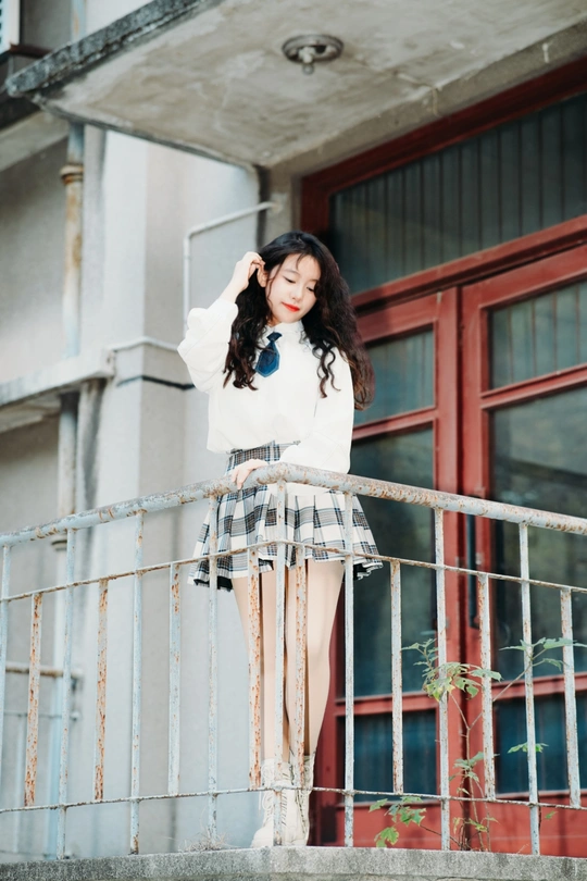 身穿短裙的少女凭栏眺望 格子裙和背后深红色的门槛显得格外搭配 撩动的头发似乎拨弄你的心绪