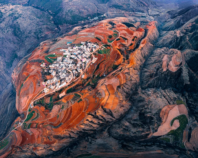 云南东川红土地,就像跳动的五线谱,遗落的调色板,层层叠叠、错落有致。红色的土地、绿色的青稞,散落在田间的村落如世外桃源。落霞沟无疑是最美的风景,鬼斧神工的沟壑之上,坐落着美丽的村庄,航拍全景大地缤纷斑斓,让人感叹大自然的神奇和人民的勤劳。