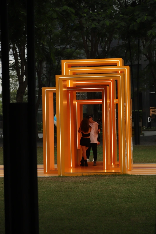 这个看似多个方框造型的东西,设置在深圳后海华润总部大厦旁边。从前面和后面看可见它实际上是多个宣传板框的组合,而从左右两侧看则成了集合在一起的线条框。接近黄昏时分时,它们在线灯点亮后呈现非常别致的累观。我在从前后侧拍照后来到左右的一侧,举起相机对准它时,猛然发现一对恋人恰巧走进了框内。我及时按下快门,记录下一个温柔时刻的画面。
