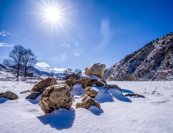 银装素裹之下,一切都如此的安静与洁净。暖阳升起,堆积在顶上的石头如同俏皮的孩子一样迫不及待的探出头要一睹这银色世界的美好。