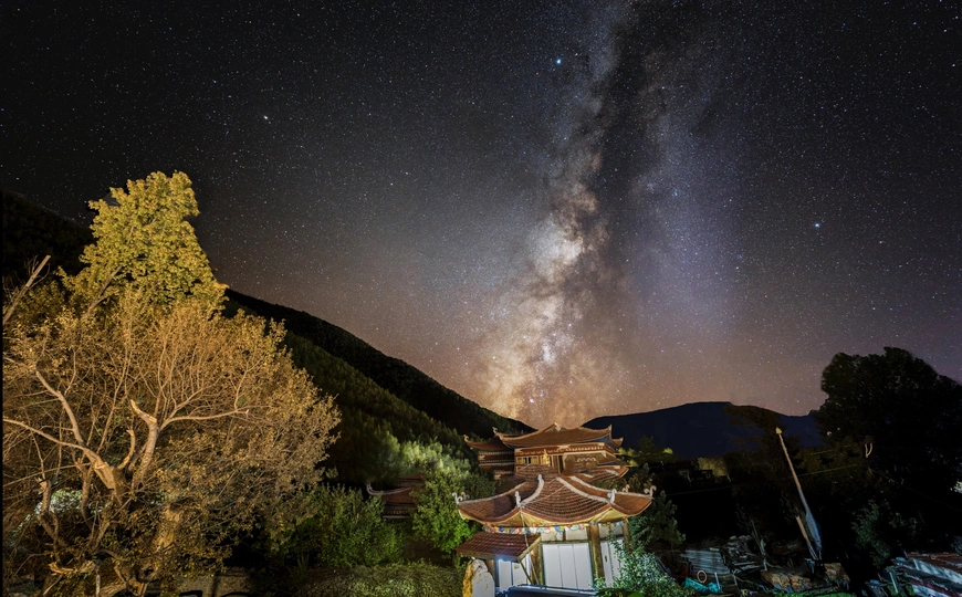 在甲根坝乡仰望星空,十月的银河,落在转经房上