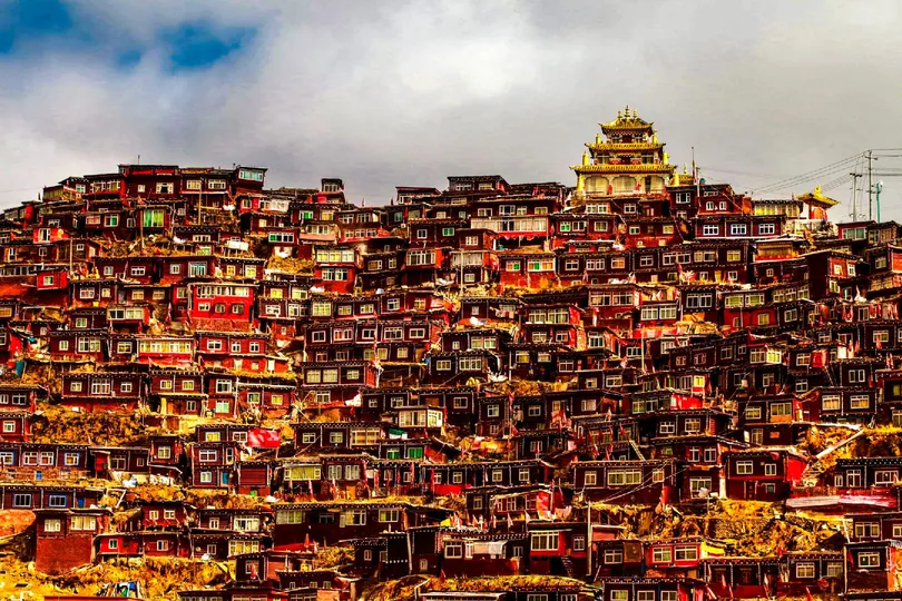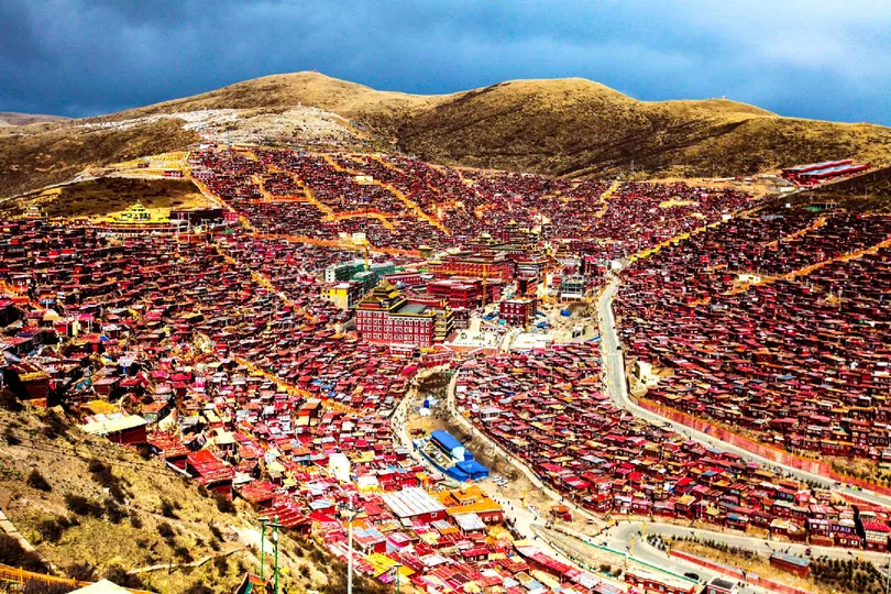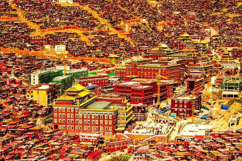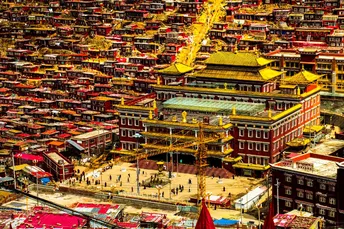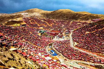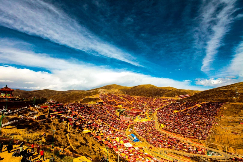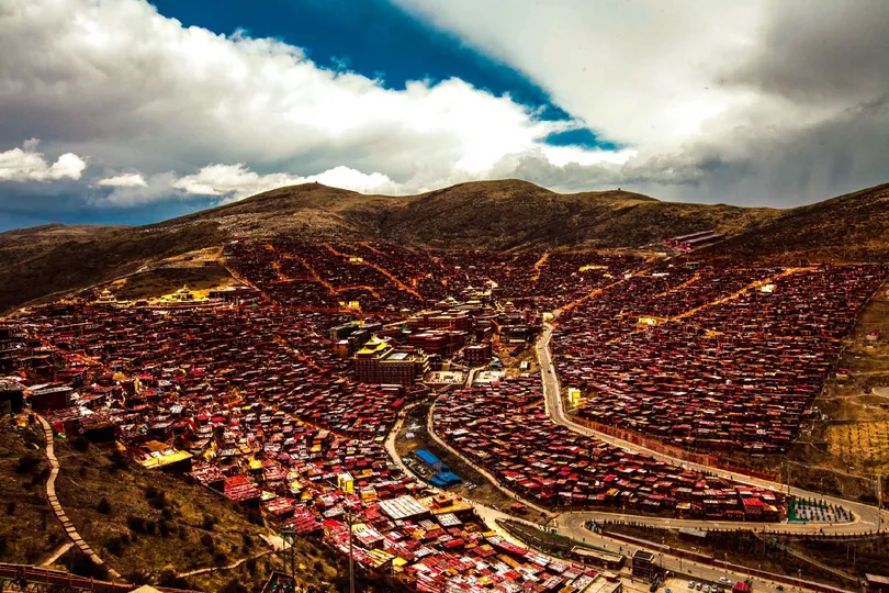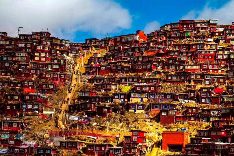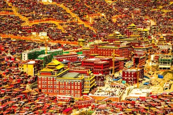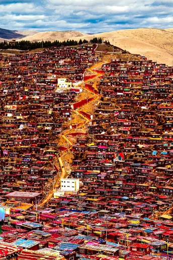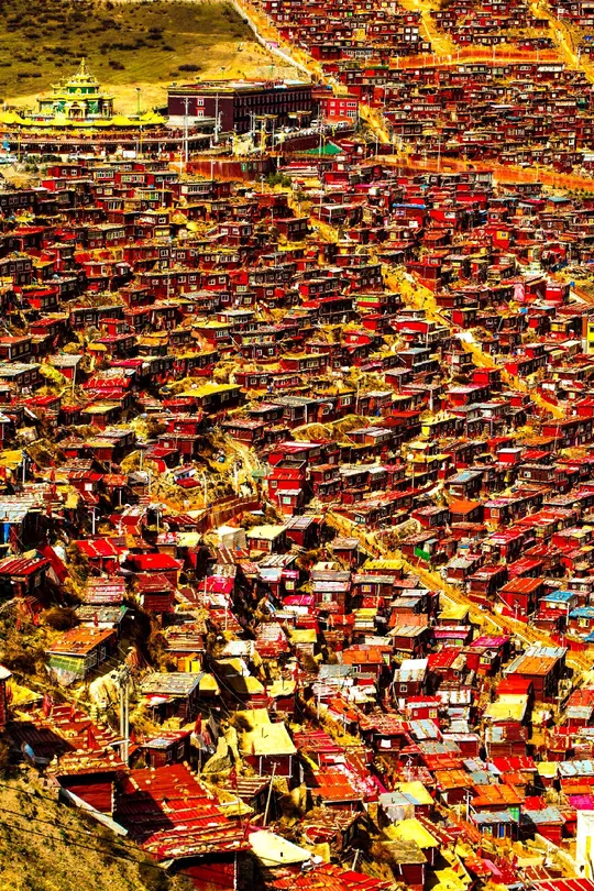鳞次栉比小红房, 参差不齐方寸间。 悟禅颂经红衣人, 今生来世求广大。 ——四川省甘孜藏族自治州色达县喇荣五明佛学院印象。这是加上步道改造后的图片,请欣赏。