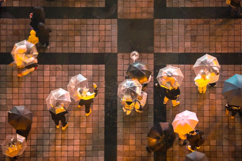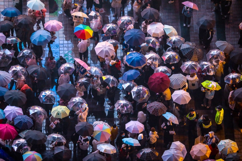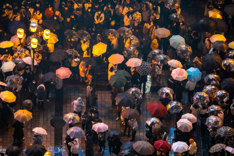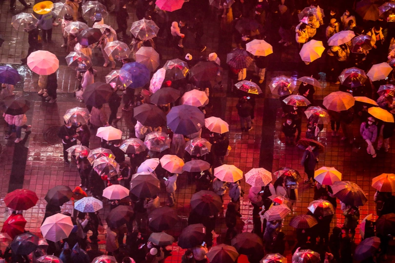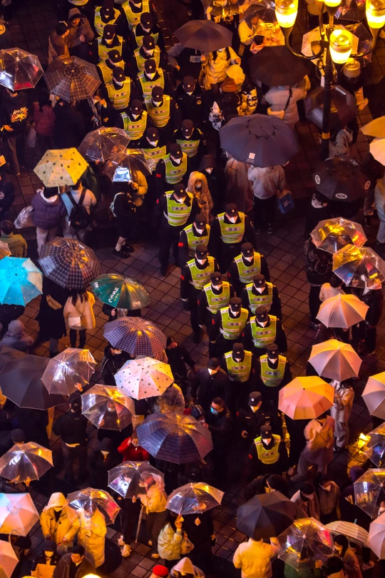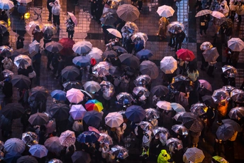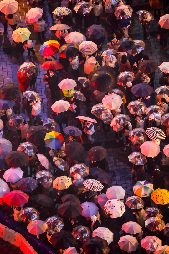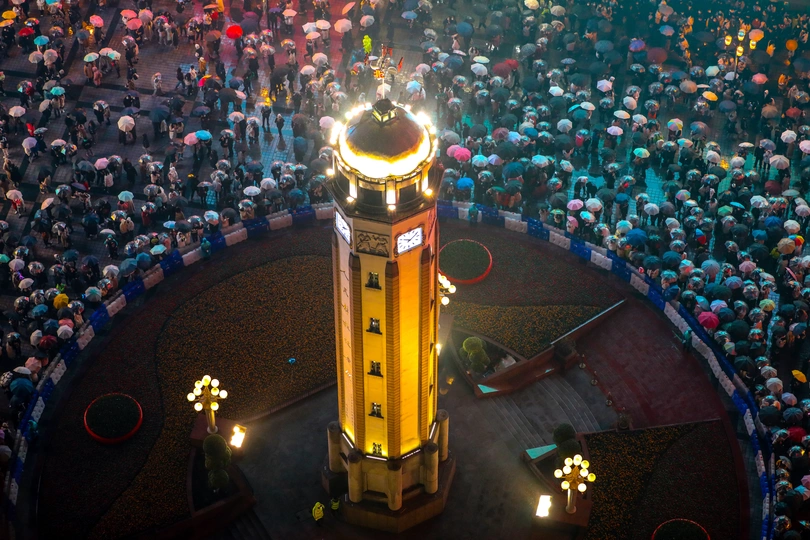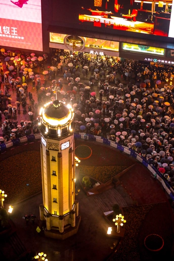 重庆解放碑步行街,每年元旦之夜都会有许多人来到到这里相聚,迎接新年钟声敲响,跨入新的一年。今年虽然人少了,但是在细雨绵绵的朦胧中,人们撑起来雨伞,就像是开在雨中的一朵朵怒放的鲜花,更是不一样的美。