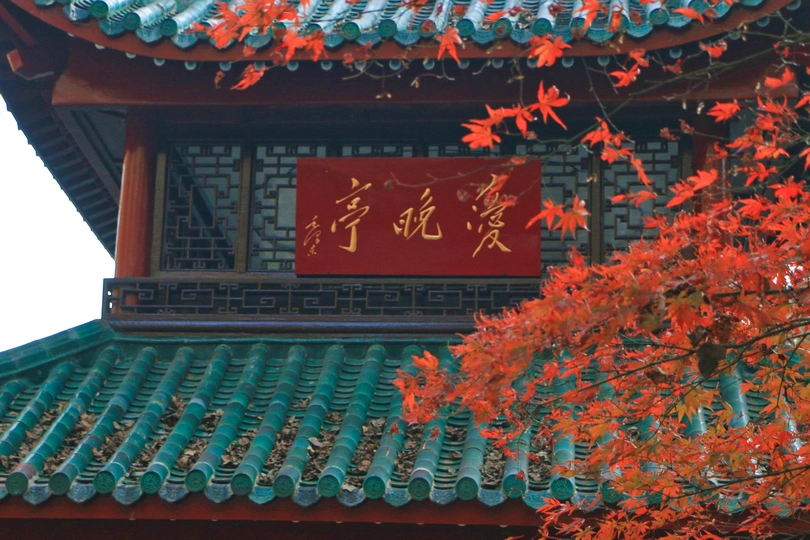 绿色的亭檐与火红的枫叶颜色激烈碰撞,共同构成了绝美的秋色。让人想到宋代蒋捷在《少年游》里写的,枫林红透晚烟青,客思满鸥汀。