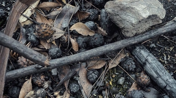 八月山火的痕迹在缙云山久久不能消散,雾气夹杂着难以消散的尘埃弥漫,走到山脚,潜入山林,不走大路,反其道行。在林野中穿行,找了一件趁手的“法器”助我登顶。摸爬滚打总算到了隔离带前后的景色反差真是让人诧异,山脚是绿树成荫,到了这里,漆黑的树木让我吃惊。黄色的土坡依旧缓缓向上延伸,我似乎能看清他的本真。向前去一排竹子做的栅栏拦住了我们的去路,小小阻碍不在话下。翻过栅栏,土壤变成了黑色,这里的树木是焦黑的,是以爆裂的姿态躺在烧成灰的叶子上的,不难想象,两个月前,重庆人名众志成城为救山火所做的牺牲。幸运的是那时深深埋在地下的种子,现在终于焕发出生机,在碳土中一抹亮眼的绿色成为新的希望。 2022年10月30日爬缙云山有感