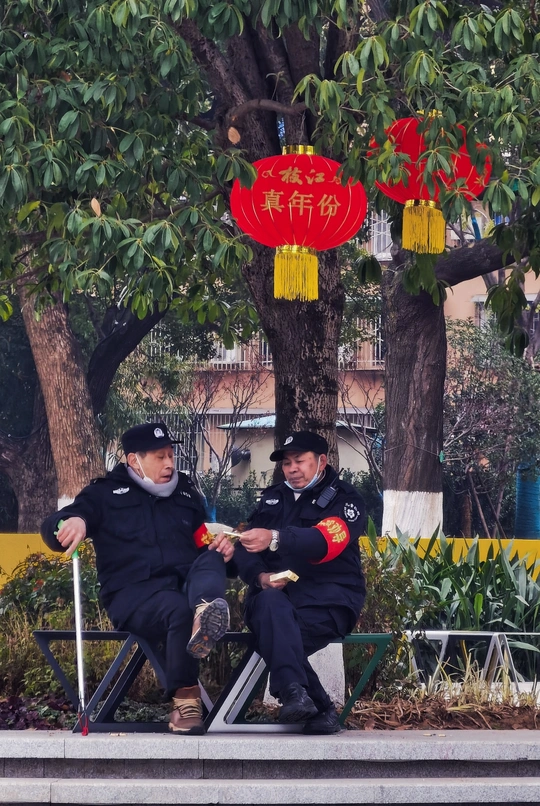 大年三十下午,街上己少有人行,路过儿童公园,两名保安面对空无一人的广场,尽心尽责坚守岗位,也许累了,老哥俩在冷风中坐下,抽支烟歇歇脚,两盏灯笼,两个人,是节日,是守望。