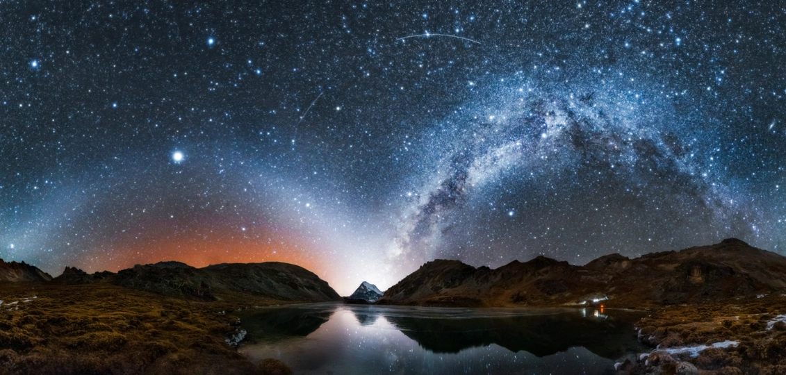 我们太阳系内分布在黄道面上的星际尘埃,对太阳 光的散射形成了左边那一道形似拱桥的黄道光;而 右边的那一道拱桥,是由无数距离我们数干、数万 乃至数亿光年外的星星组成的银河;在它们的交汇 处,是数千万年前的板块运动所造就,屹立在青藏 高原最东端的川西高原之上干千万万年的仙乃日神 山,而这一刻,来自不同时空的光,同时出现在了 24岁的我的眼前,我所能做的按下快门,记录下这 一次穿越茫茫时空的相遇。