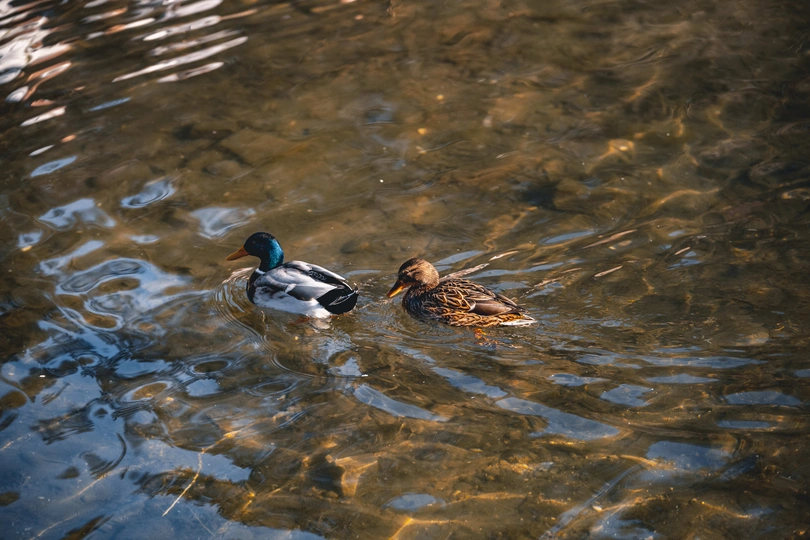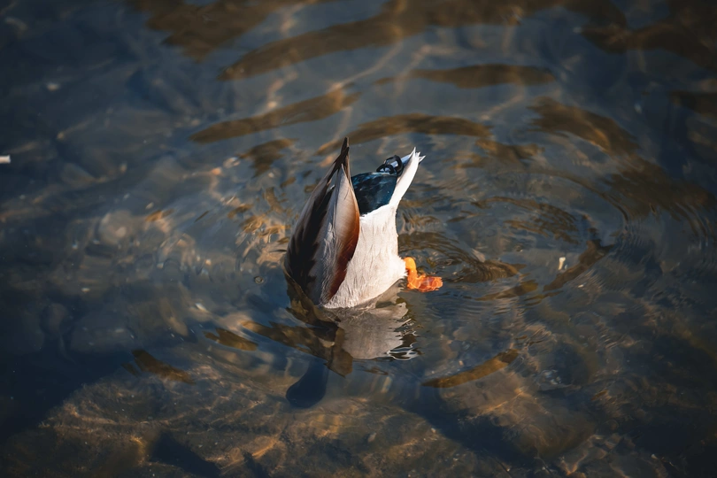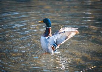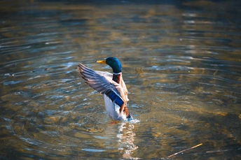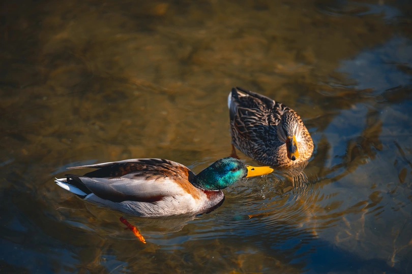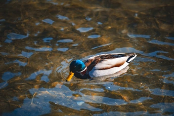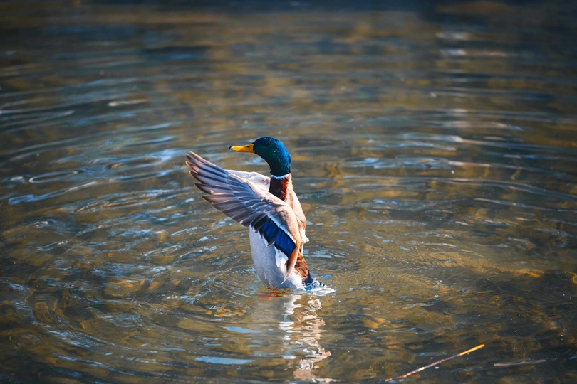 拍摄于圆明园公园。绿头鸭(学名:Anas platyrhynchos)属游禽,大型鸭类。体长47-62厘米,体重大约1千克,外形大小和家鸭相似。雄鸟嘴黄绿色,脚橙黄色,头和颈辉绿色,颈部有一明显的白色领环。上体黑褐色,腰和尾上覆羽黑色,两对中央尾羽亦为黑色,且向上卷曲成钩状;外侧尾羽白色。胸栗色。翅、两肋和腹灰白色,具紫蓝色翼镜,翼镜上下缘具宽的白边,飞行时极醒目。雌鸭嘴黑褐色,嘴端暗棕黄色,脚橙黄色和具有的紫蓝色翼镜及翼镜前后缘宽阔的白边等特征。
