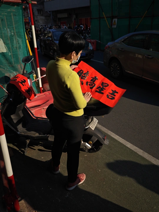 市民端祥着刚买好的挥春