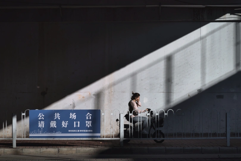 倡议戴好口罩的标语与没戴口罩掩嘴经过的路人形成有趣的对比。@米拍社长