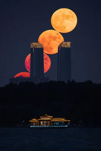 摄于2022年中秋佳节,杭州之门伫立在钱塘江畔,是杭州的新地标建筑,当一轮圆月慢慢爬至杭州之门顶端,这是最圆满的时刻。