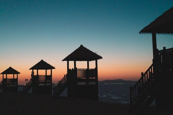 夜幕降临之际,天边的橘红和草亭构成一幅美妙画卷。