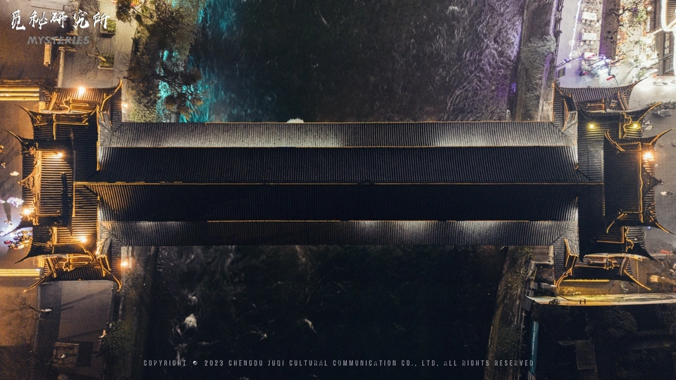 看着都江堰的古廊桥, 横跨输送全成都的岷江支流, 在夜晚间的灯光映衬下, 在天空的俯瞰视角中, 建筑的几何美凸显无疑。