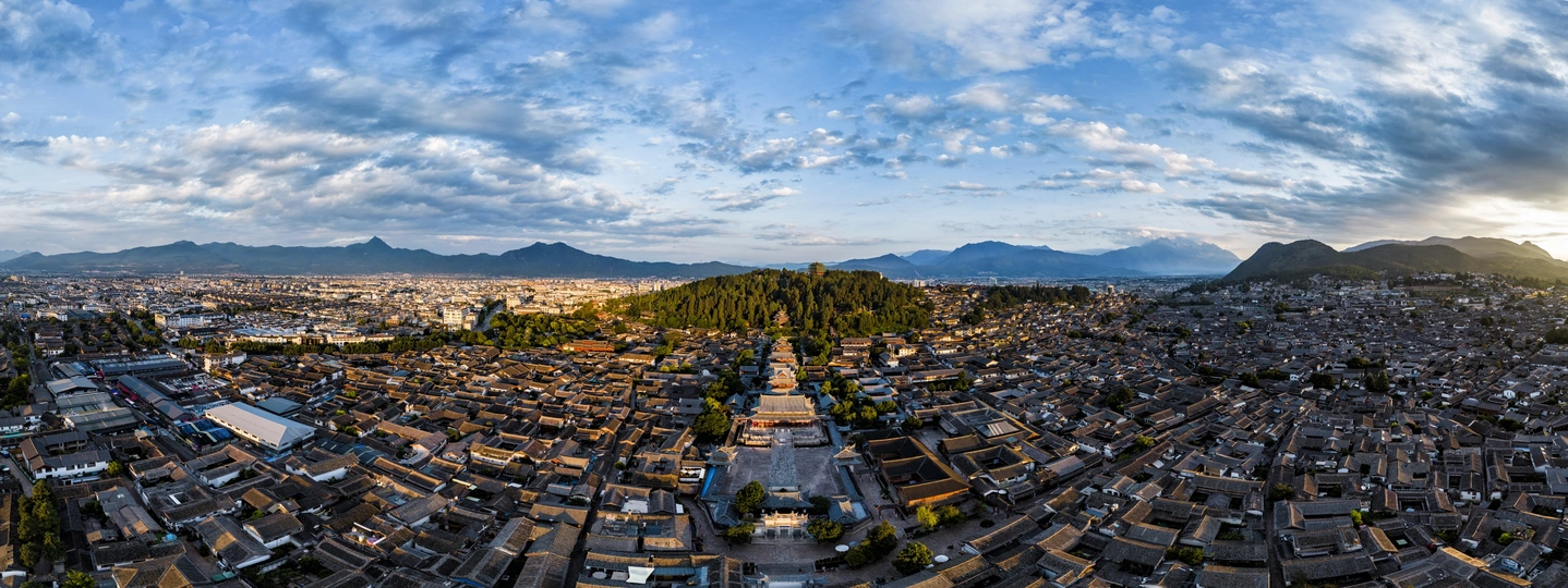 无人机 接片呈现宽幅摄影魅力 背后玉龙雪山的暗与日出的明形成阴阳交汇的动人长江 金色洒在木府与狮子山轴线上